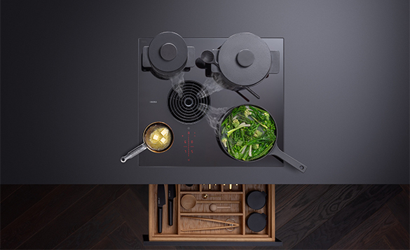 Kochfeld und Abzug sind komplett flächenbündig. Die perfekte Linienführung erlaubt eine ebenso unauffällige wie hochelegante Integration in jede moderne Küchenarchitektur. Die Bedienung im Standby ist nahezu unsichtbar und im Betrieb durch intelligente Beleuchtung aufs Wesentliche reduziert.