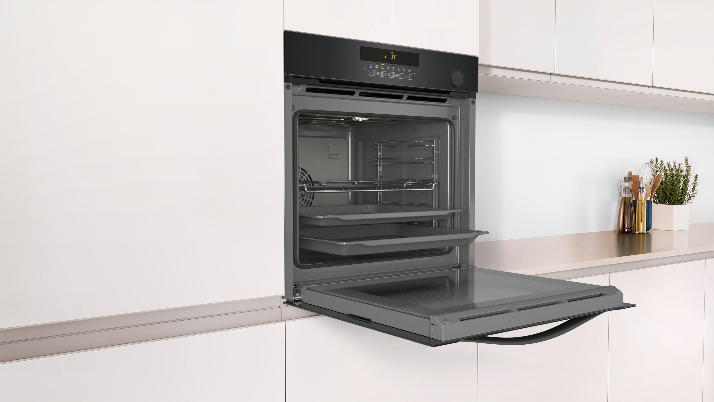 Mit der Dampfunterstützung wird automatisch die richtige Menge an Dampf zum richtigen Zeitpunkt zugegeben - für noch bessere Backergebnisse. Einfach den in der Blende integrierten Wassertank auffüllen, und die im Rezept vorgeschlagene Heizart mit der Dampfunterstützung kombinieren. Die passende Dampfzugabe wird dann automatisch geregelt. Und so wird der Backofen zum Lieferanten für knuspriges Brot und saftige Braten.
