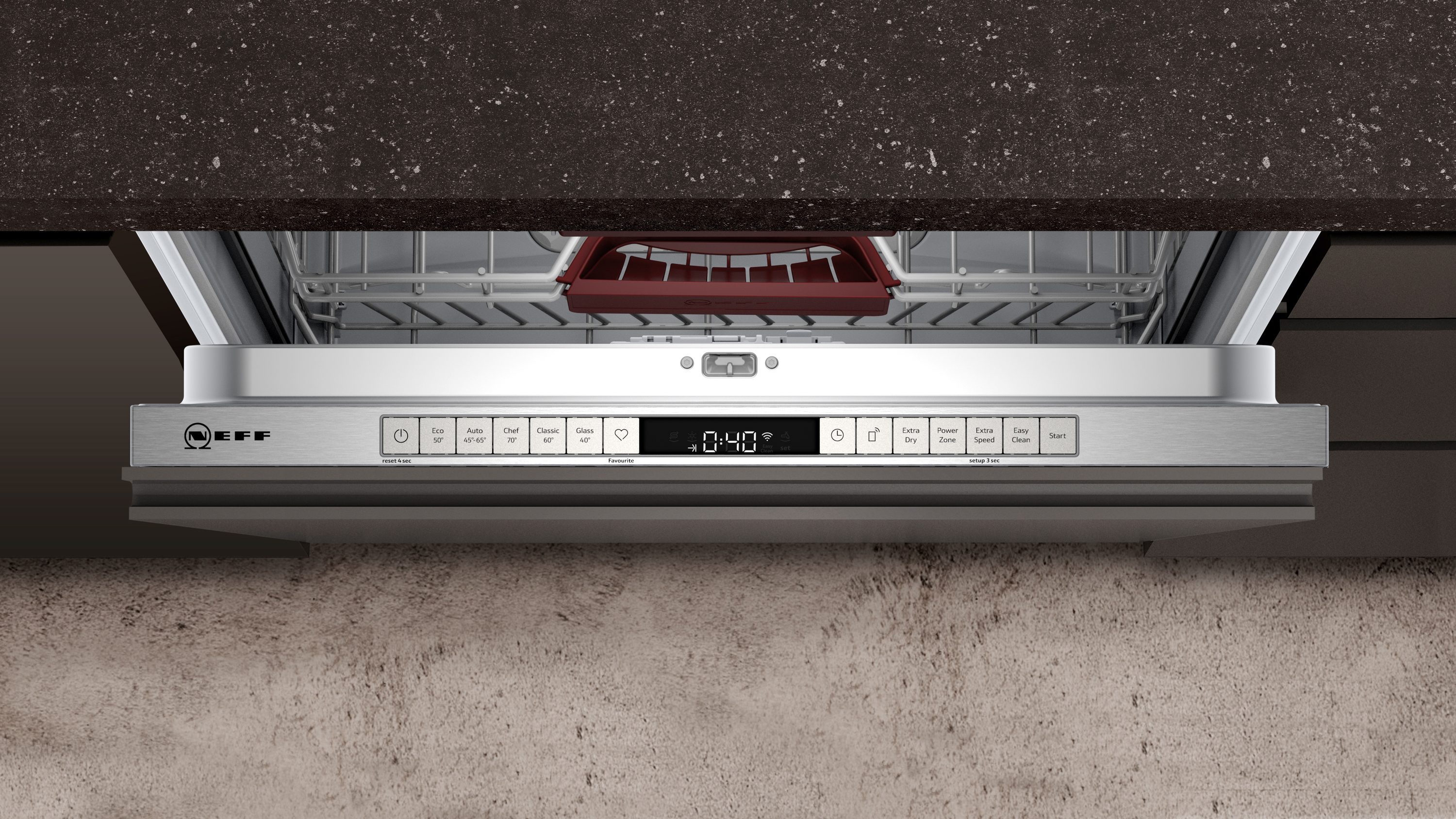Leistung und Verbrauch Energieeffizienzklasse¹: E Energie² / Wasser³: 94 kWh / 9.5 Liter Fassungsvermögen: 13 Maßgedecke Programmdauer⁴: 3:45 (h:min) Geräusch: 46 dB(A) re 1 pW Geräusch-Effizienzklasse: C Programme und Optionen 6 Programme: Eco 50 °C, Auto 45-65 °C, Chef 70 °C, Kurz 60 °C, Glas 40 °C, Favorit Vorspülen 4 Sonderfunktionen: Fernstart, Extra Trocknen, IntensivZone, VarioSpeed Plus EasyClean Silence on Demand (per App) Spültechnik und Sensorik Wärmetauscher. Aquasensor Dosier Assistent EfficientSilentDrive Reiniger-Automatik Innenbehälter/Boden: Edelstahl/Polinox Korbsysteme Flex II Korbsystem FlexSchublade Höhenverstellbarer Oberkorb mit RackMatic® (3-stufig) Komfortrollen im Unterkorb Korbstopper (Rack Stopper) gegen ein Überrollen des Unterkorbes Umklappbare Stachelreihe im Oberkorb Umklappbare Stachelreihen im Unterkorb (4x) Tassenablage im Oberkorb (2-teilig) Anzeige und Bedienung Home Connect-fähig über WLAN Bedienung von oben Bedienblende mit Klartext (englisch) InfoLight rot Restzeitanzeige in Minuten Startzeitvorwahl 1-24 Stunden Technische Informationen und Zubehör Aqua Stop: eine Neff Garantie bei Wasserschäden - ein Geräteleben lang* Integrierter Glasschutz Inkl. Dampfschutz-Blech Gerätemaße (H x B x T): 86.5 cm x 59.8 cm x 55.0 cm