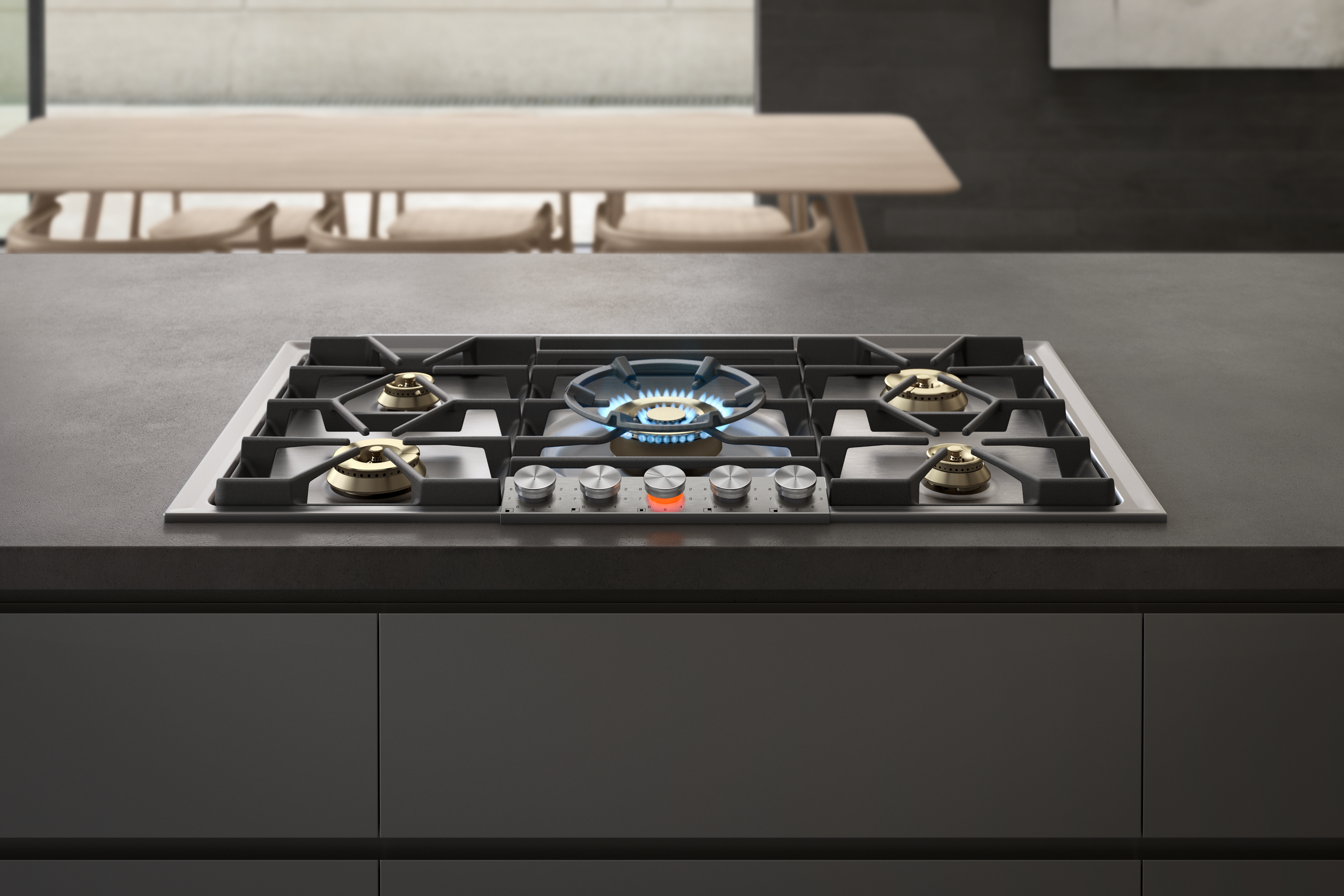 Bedienblende für eine komfortable und sichere Handhabung Mechanische Stufenregulierung für exakt einstellbare und reproduzierbare Flammengröße in 9 Leistungsstufen Mehrkreis-Brenner aus robustem, hitzebeständigem Messing wie in der Profi-Küche Glattflächige Gussroste Bis zu 18 kW auf 5 Brennern weitere Details Bedienblende für eine komfortable und sichere Handhabung Mechanische Stufenregulierung für exakt einstellbare und reproduzierbare Flammengröße in 9 Leistungsstufen Mehrkreis-Brenner aus robustem, hitzebeständigem Messing wie in der Profi-Küche Glattflächige Gussroste Bis zu 18 kW auf 5 Brennern Kochzonen 1 Mehrkreis-Wokbrenner (300 W – 6000 W), geeignet für Töpfe bis max. ø 32 cm. 2 Starkbrenner mit 2 Flammenkreisen (170 W – 4000 W), geeignet für Töpfe bis max. ø 28 cm. 2 Normalbrenner mit 2 Flammenkreisen (170 W – 2000 W), geeignet für Töpfe bis max. ø 24 cm. Bedienung Bedienknebel mit Leuchtring. Integrierte Bedienblende. Einhandbedienung. Elektrozündung. Ausstattung Dreiteiliger Gussrost mit ebener, durchgehender Topffläche. Brennerringe aus Messing. Sicherheit Thermoelektrische Flammenüberwachung. Restwärmeanzeige. Betriebsanzeige. Planungshinweise Spezialdüsen für Flüssiggas 50 mbar sind als Ersatzteile zu bestellen. Kein Zwischenboden erforderlich. Gerät ist von oben in die Arbeitsplatte einschnappbar. Rückwand und Wandabschlussleisten müssen hitzebeständig und aus nicht brennbarem Material sein. Einbau in mind. 90 cm breiten Unterschrank empfohlen. Seitlichen Abstand zu wärmeempfindlichen Möbelteilen oder Anstellflächen von mind. 300 mm beachten oder eine wärmedämmende Isolierung anbringen. Bei einer Gesamtleistung der installierten Gaskochfelder über 11 kW sind die örtlichen Vorschriften hinsichtlich Raumlüftung, Raumgröße und Kombination mit Dunstabzugshauben im Abluft- oder Umluftbetrieb zu beachten. Der Mindestabstand von der Kochfeldoberfläche zu einem darüber montierten Möbel aus brennbarem Material beträgt 76 cm. Der Mindestabstand zu einer übergebauten Abzugshaube ist bei den Planungshinweisen der individuellen Abzugshaube zu beachten. Gerätegewicht: ca. 29 kg. Anschlussdaten Gesamtanschlusswert Gas 18.0 kW. Gesamtanschlusswert Elektro 10 W. Anschlusskabel 1.5 m mit Stecker.