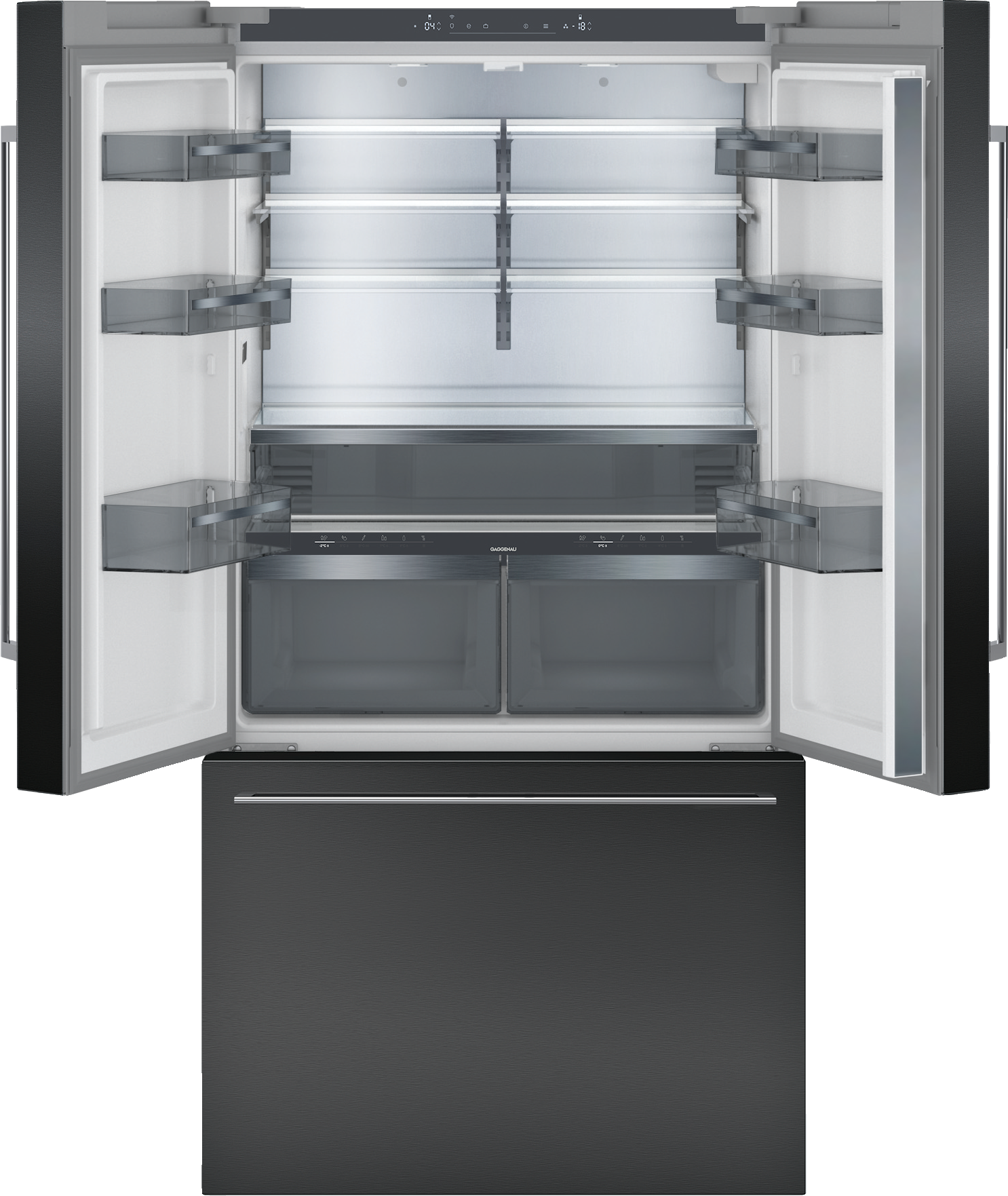 Die Gaggenau RY295350 Stand-Kühl-Gefrierkombination in Edelstahl, schwarz ist ein schicker Hingucker in der Küche. Der freistehende Kühlschrank mit unten liegendem Gefrierschrank überzeugt mit zwei Flügeltüren (French Door) und einem integrierten Wasserspender für gekühltes Wasser sowie einem Eisbereiter.