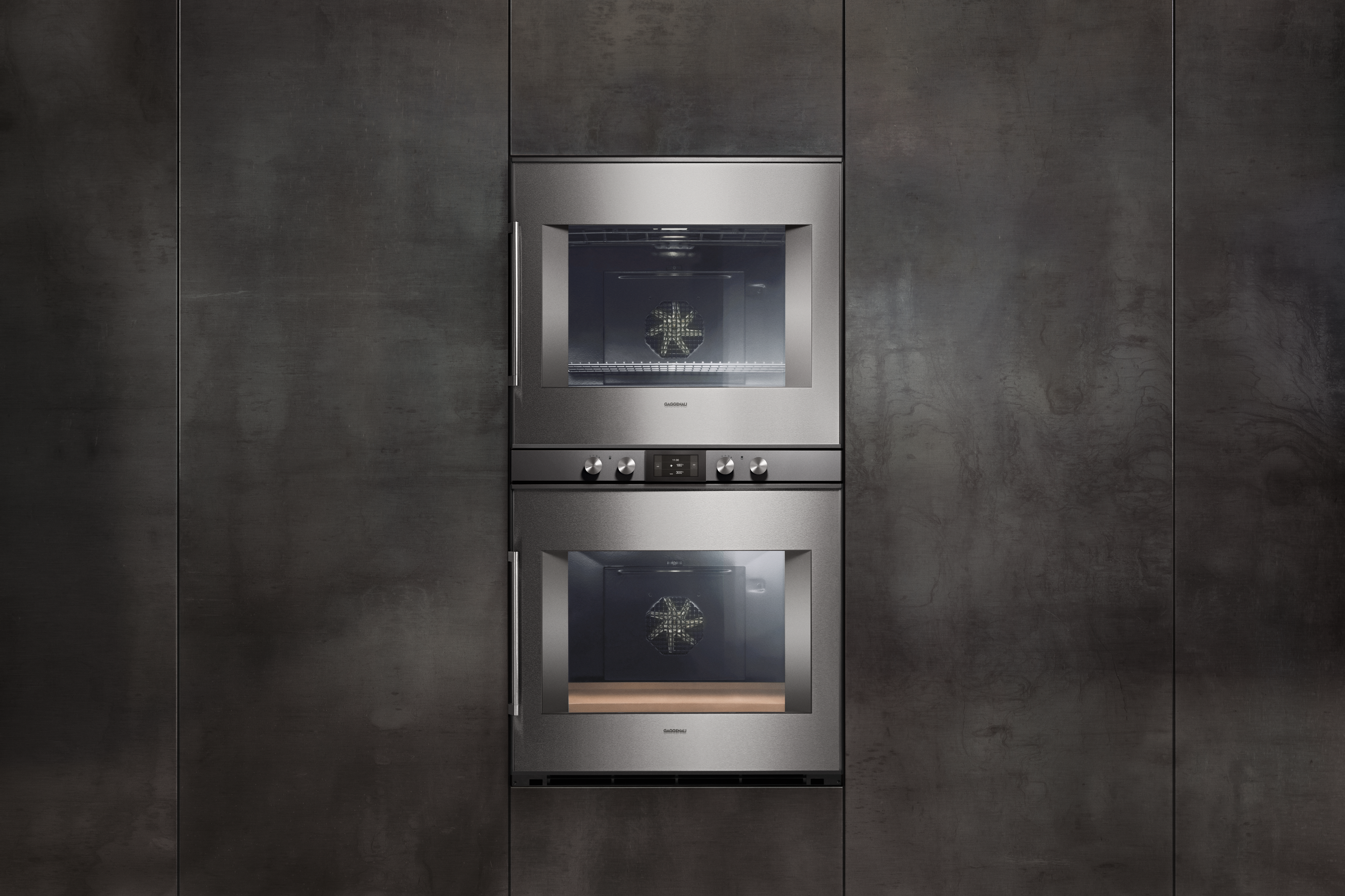 Der Gaggenau Doppel-Backofen ist ein Gigant unter den Backöfen. Mit 220 Liter Volumen auf 76 Breite und knapp 1,5 Meter Höhe bietet er maximalen Raum zum Backen und Garen im Ofen. Natürlich in gewohnter Gaggenau Qualität mit zahlreichen (Profi-) Heizmethoden wie Heißluft, Flächengrill oder Gären und Zubehör wie Kerntemperaturfühler und Drehspieß. Die moderne Bedienung aus einer Kombi mit Drehknebel und Touch Display befindet sich mittig zwischen den beiden Backöfen. Das Modell Gaggenau BX480112 erscheint in gebürstetem Edelstahl mit Türanschlag rechts.