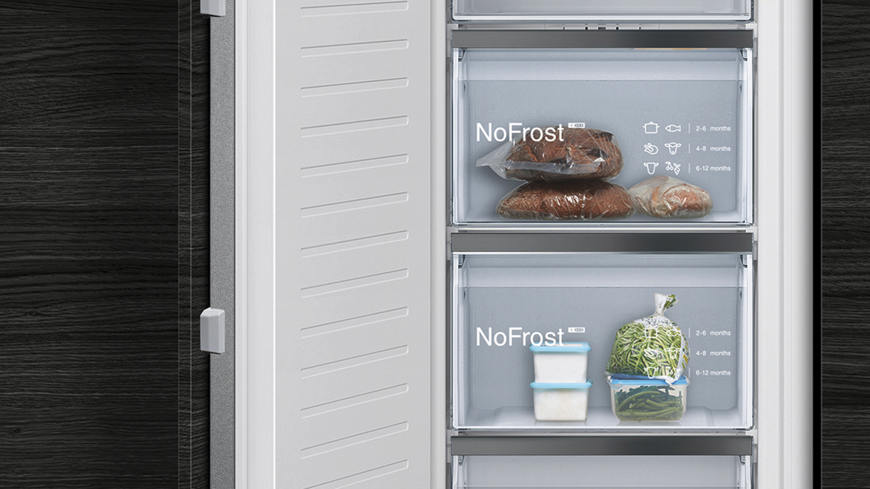 Das Gefrierfach abtauen, damit das Gefriergut einwandfrei bleibt und Ihr Gerät energieeffizient läuft? Das brauchen Sie jetzt nicht mehr. Die noFrost-Technologie eliminiert Feuchtigkeit und hält die Luft trocken, sodass sich kein Eis an den Seiten oder auf den Lebensmitteln bilden kann. Dadurch sparen Sie nicht nur Aufwand, sondern auch Energie, weil ein frostfreies Gefrierfach einfach effizienter ist.