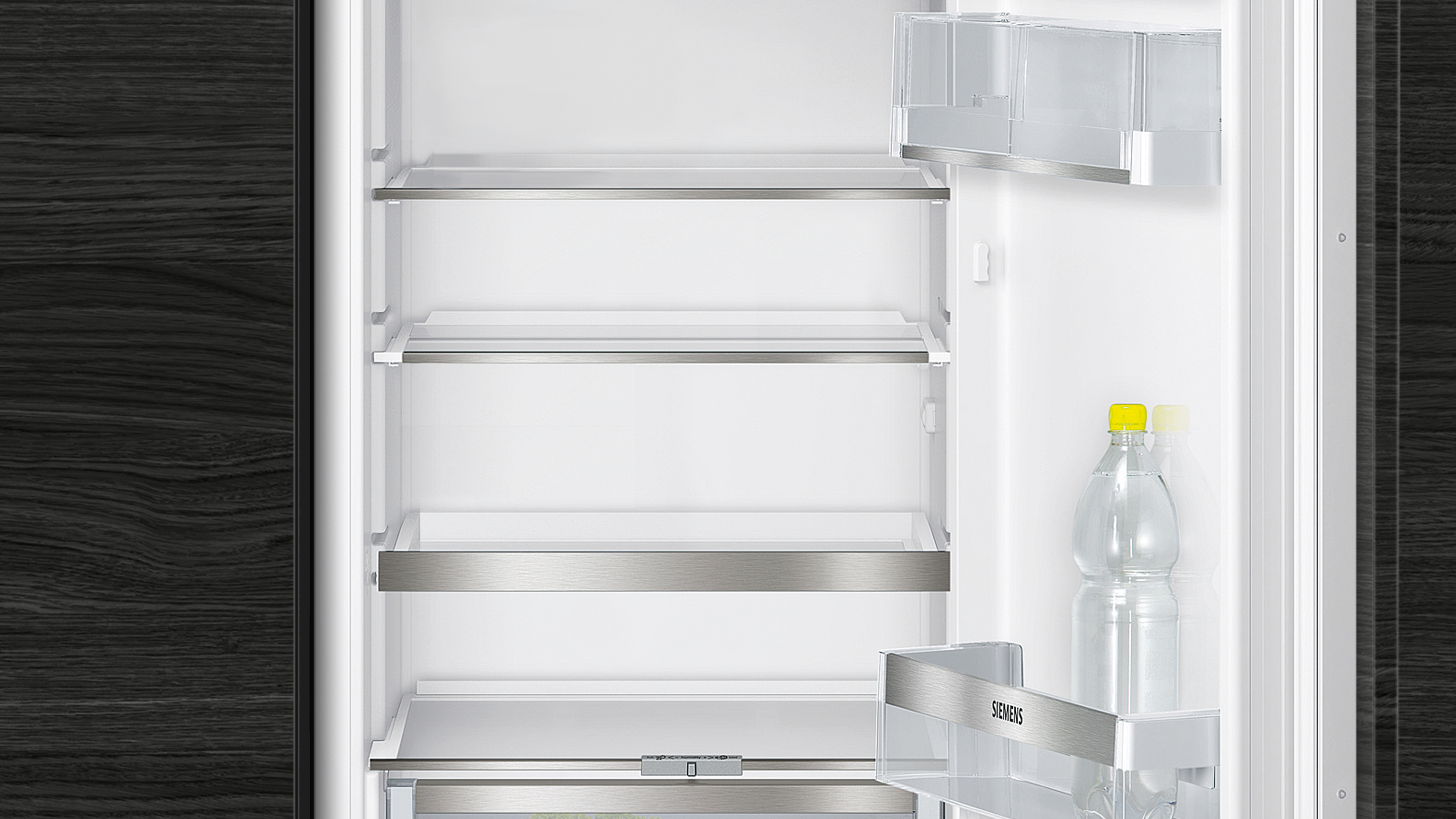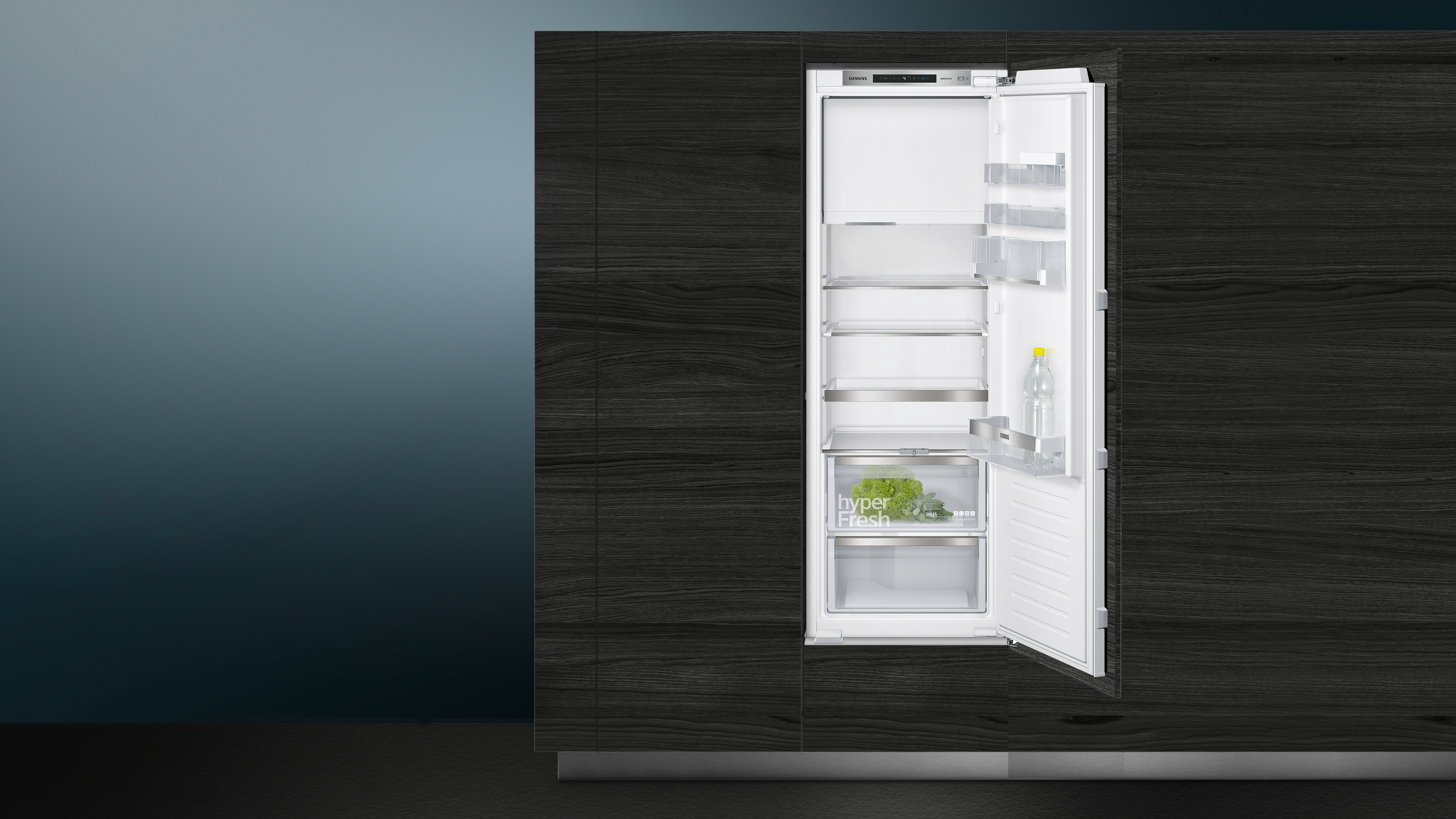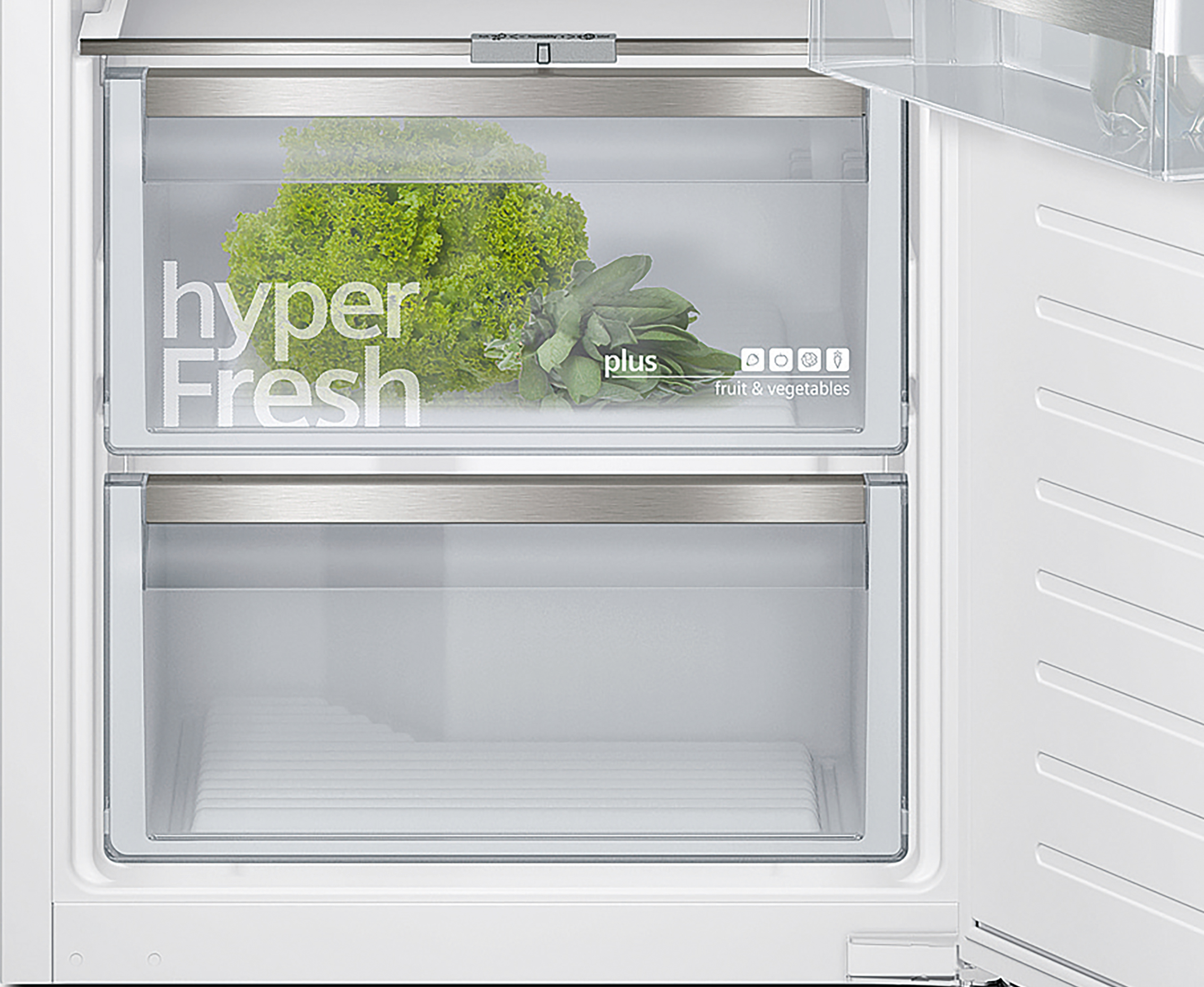 coolEfficiency Einbau-Kühlschrank mit hyperFresh plus Box für bis zu 2 mal längere Frische bei Obst und Gemüse, flexiblem varioShelf und softClosing Tür.