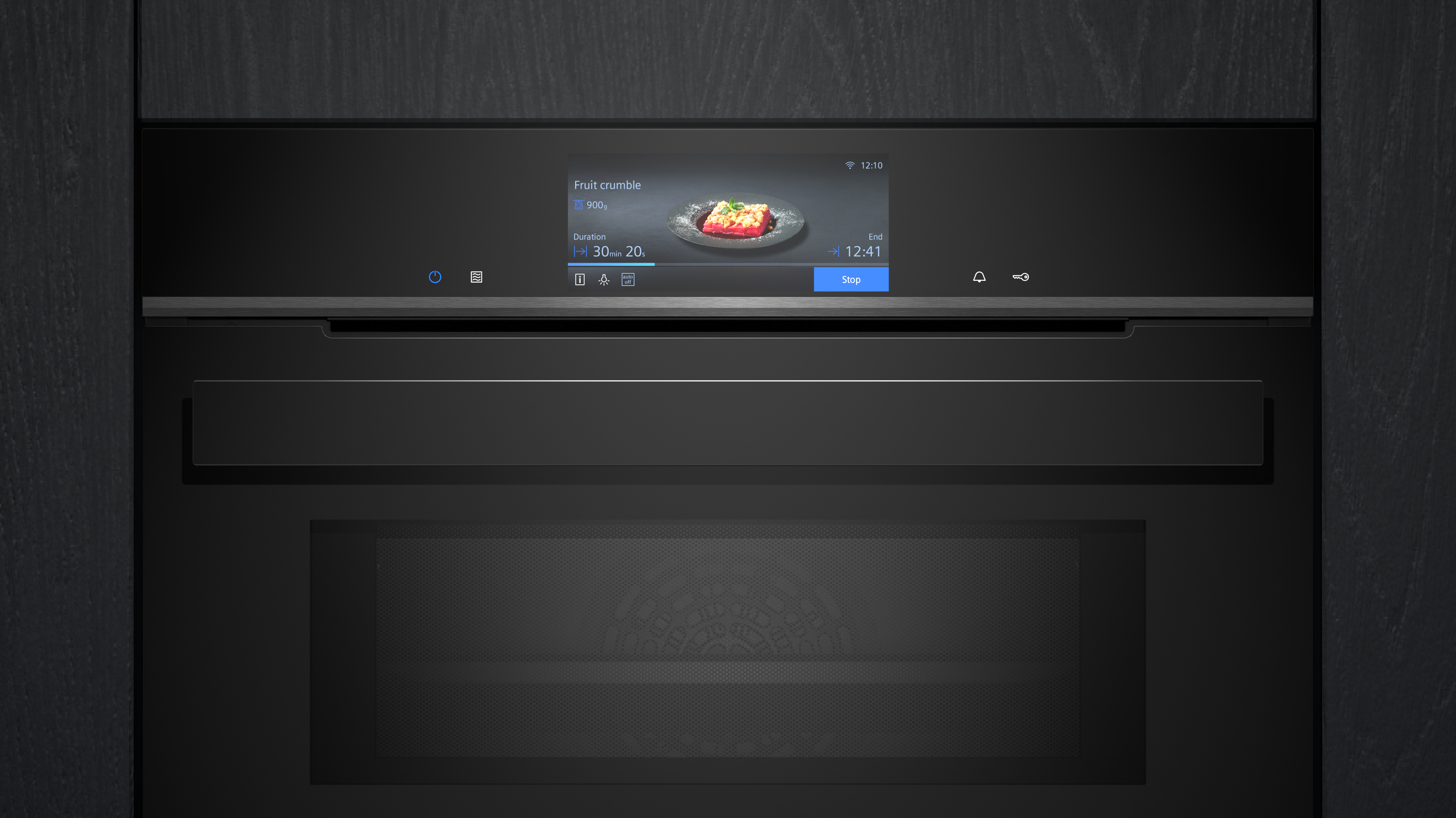 Backofentyp und Heizart Backofen mit Mikrowelle mit 21 Beheizungsarten: 4D Heißluft, Ober-/Unterhitze, Umluftgrill, Großflächengrill, Kleinflächengrill, Pizzastufe, coolStart, separate Unterhitze, Intensivhitze, Sanftgaren, Vorwärmen von Geschirr, Dörren, Warmhalten, Heißluft Sanft, Ober-/Unterhitze sanft, Mikrowelle, 4D Heißluft + Mikrowelle, Ober-/Unterhitze + Mikrowelle, Großflächengrill + Mikrowelle, Kleinflächengrill + Mikrowelle, Umluftgrillen + Mikrowelle Zusätzliche Heizarten über die Home Connect App: Air Fry, Ruhen lassen, Vorwärmen Max. Power: 800 W; 5 Mikrowellen-Leistungsstufen (90 W,180 W,360 W,600 W, boost) mit Inverter (MW) Intelligente Inverter-Technologie: die Maximal-Leistung wird bei längerem Betrieb bis auf 600 W reguliert Temperaturregelung von 30 °C - 300 °C Garraumvolumen: 67 L Zubehörträger / Auszugssystem: Einschubebenen: 5 1-fach Teleskop Auszug, Normalauszug, activeClean fähig Design blackSteel Design touchControl-Bedienung studioLine Glasgriff Garraum: Email anthrazit Reinigung activeClean® - Selbstreinigungs-Automatik humidClean (Hydrolytische Reinigungshilfe): Leichte Verschmutzungen entfernen mit Wasserdampf und Spülmittel. Komfort Backofenassistent mit Sprachsteuerung (über Amazon Alexa) TFT-Full-Touchdisplay Pro Elektronik-Uhr Optische Aufheizkontrolle elektronische Einstellempfehlung Ist-Temperaturkontrolle Bratenthermometer Restlaufzeitprognose softClose softMove: Sanftes Öffnen und Schließen der Backofentür. cookControl Pro: In der Gerichte-Funktion stehen mehrere Zubereitungsmöglichkeiten zur Auswahl Bratenthermometer Plus: 3 Messpunkte sorgen für ein perfektes Messergebnis. Inklusive Endezeit-Prognose durch KI. Backsensor Plus: Der Backsensor, der erkennt, wann der Kuchen fertig ist. Inklusive Endezeit-Prognose durch KI. Schnellaufheizung: Schnell zur Zieltemperatur ohne höheren Energieverbrauch coolStart Heizart: Ohne Vorheizen Tiefkühlgerichte zubereiten Backofenbeleuchtung abschaltbar, LED-Innenbeleuchtung Kühlgebläse Home Connect Zubehör 1 x Backblech emailliert, 1 x Kombirost, 1 x Universalpfanne Umwelt und Sicherheit Sehr geringe Fenstertemperatur 4-fache Türverglasung Kindersicherung mit verriegelbarer Backofentür Sicherheitsabschaltung Restwärmeanzeige Starttaste Türkontaktschalter Technische Info Länge des Anschlusskabels: 120 cm Nennspannung: 220 - 240 V Gesamtanschlusswert Elektro: 3.6 kW Maße Gerätemaße (HxBxT): 595 x 594 x 548mm Nischenmaße (HxBxT): 595 mm x 560 mm x 550 mm „Maße und Einbauhinweise zu diesem Gerät gemäß technischer Zeichnung beachten“