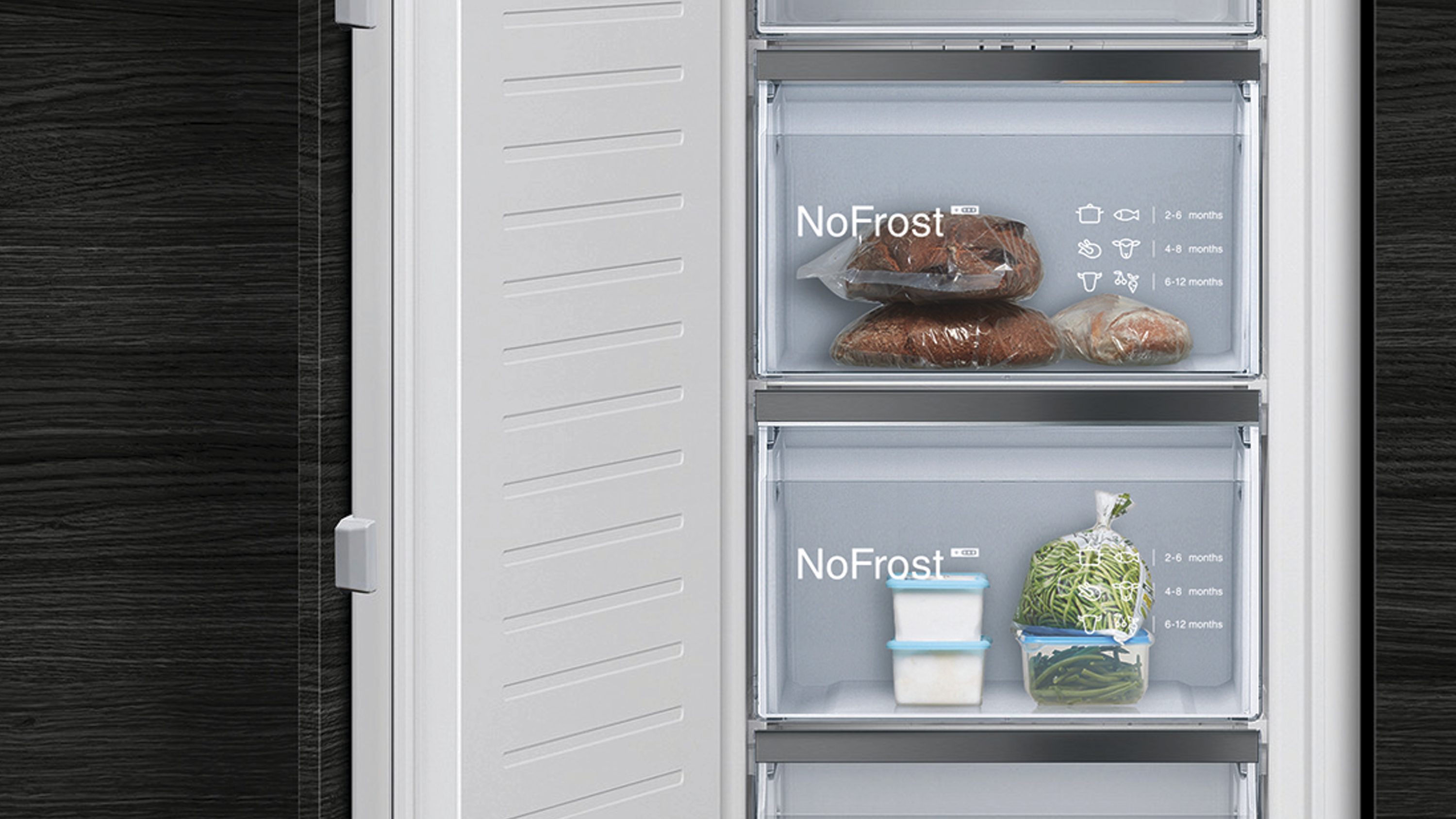 Das Gefrierfach abtauen, damit das Gefriergut einwandfrei bleibt und Ihr Gerät energieeffizient läuft? Das brauchen Sie jetzt nicht mehr. Die noFrost-Technologie eliminiert Feuchtigkeit und hält die Luft trocken, sodass sich kein Eis an den Seiten oder auf den Lebensmitteln bilden kann. Dadurch sparen Sie nicht nur Aufwand, sondern auch Energie, weil ein frostfreies Gefrierfach einfach effizienter ist.