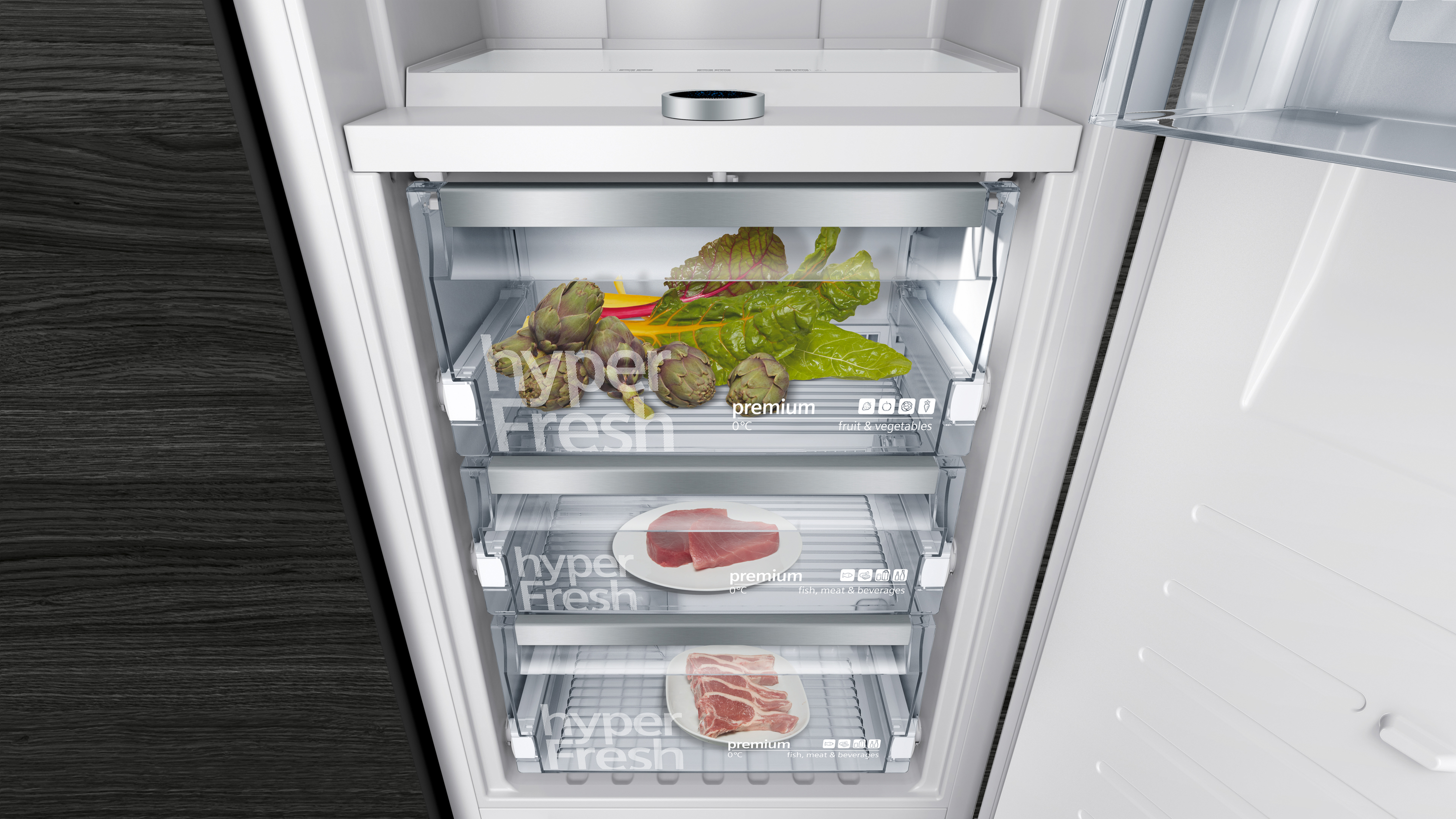 Tun Sie Ihrer Gesundheit etwas Gutes – mit unserem optimalen Frischesystem. hyperFresh Premium 0 °C hat ein luft- und temperaturgeregeltes Fach speziell für Obst und Gemüse und ein extrakühles Fach für Fisch und Fleisch. Ideale Bedingungen also, unter denen alle Aromen und wichtigen Nährstoffe länger bewahrt werden.